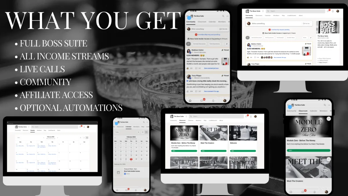 Boss Suite™ brings everything together — systems, offers, and support — so you can build and grow from one simple hub.